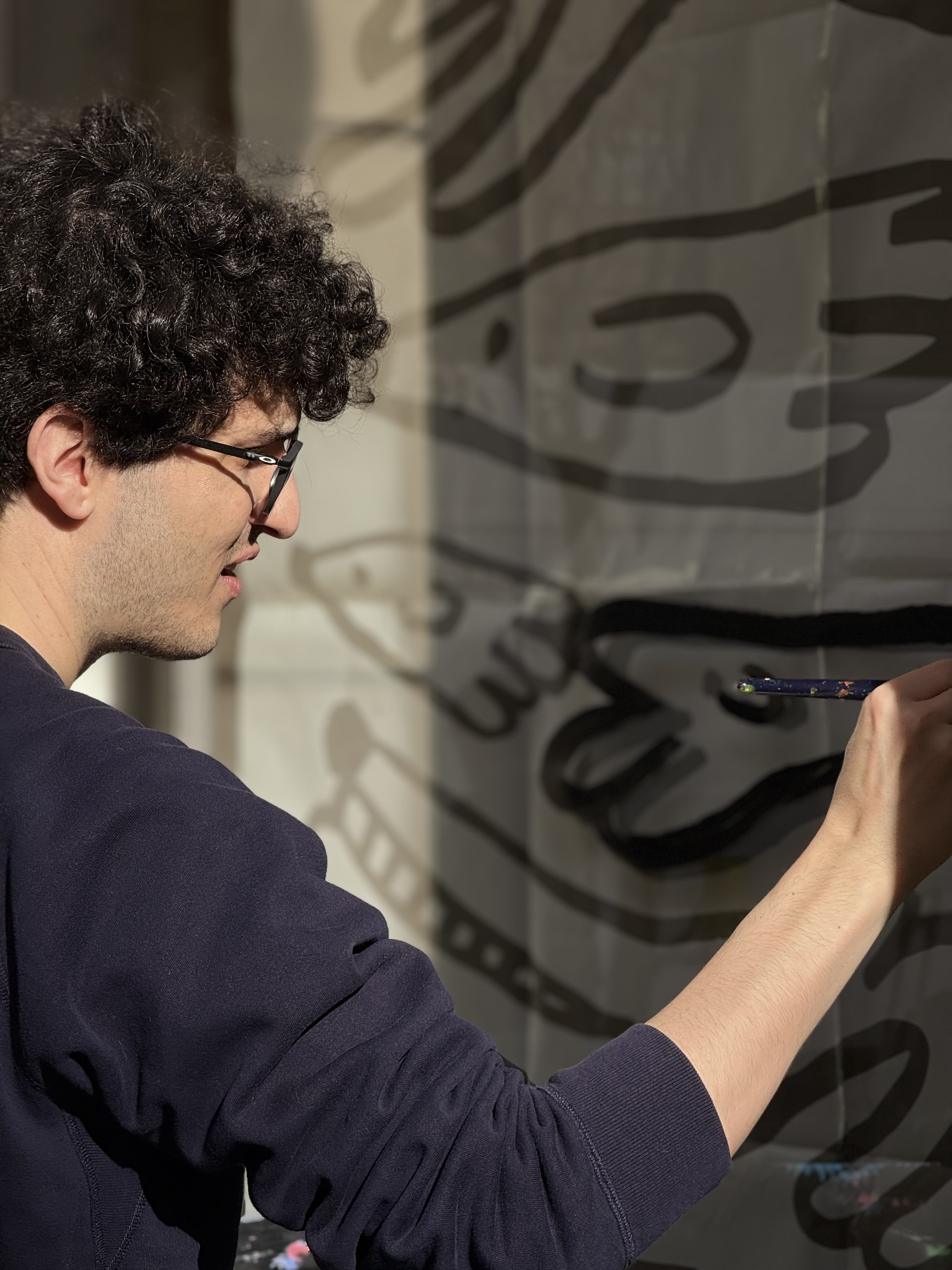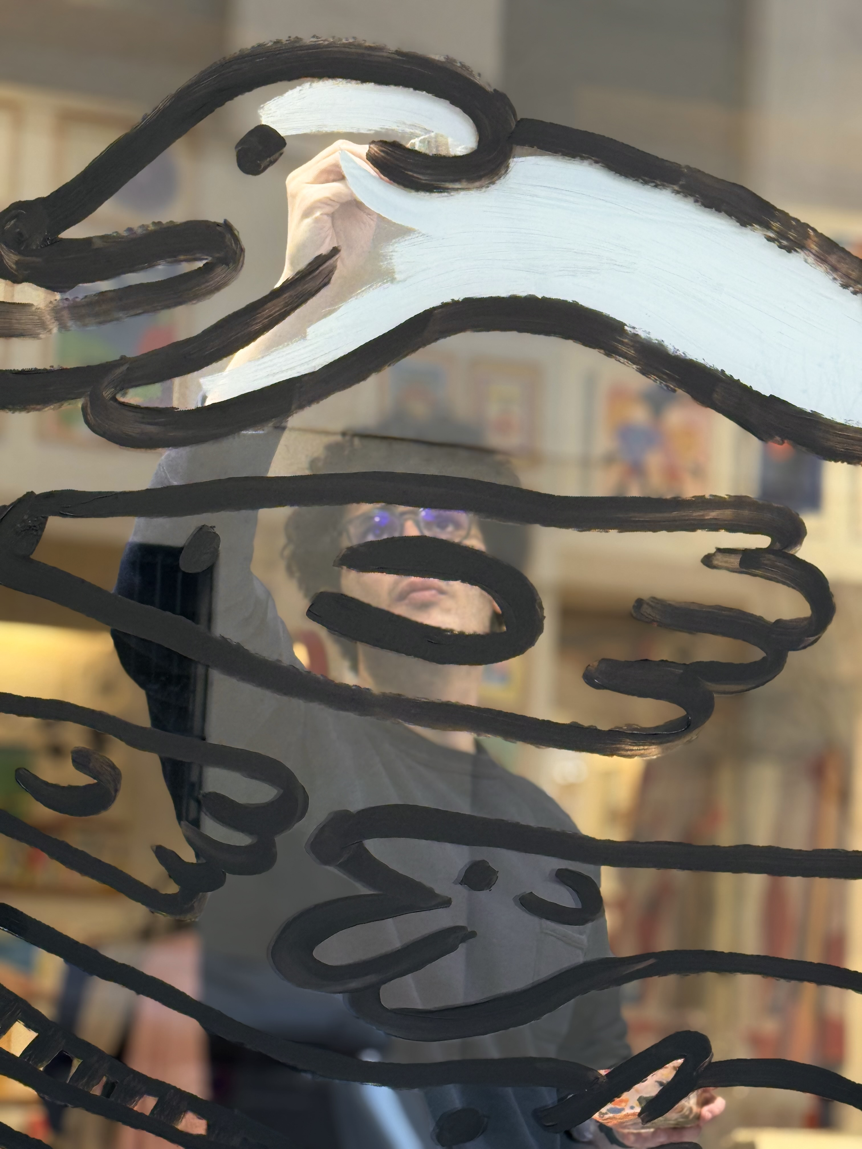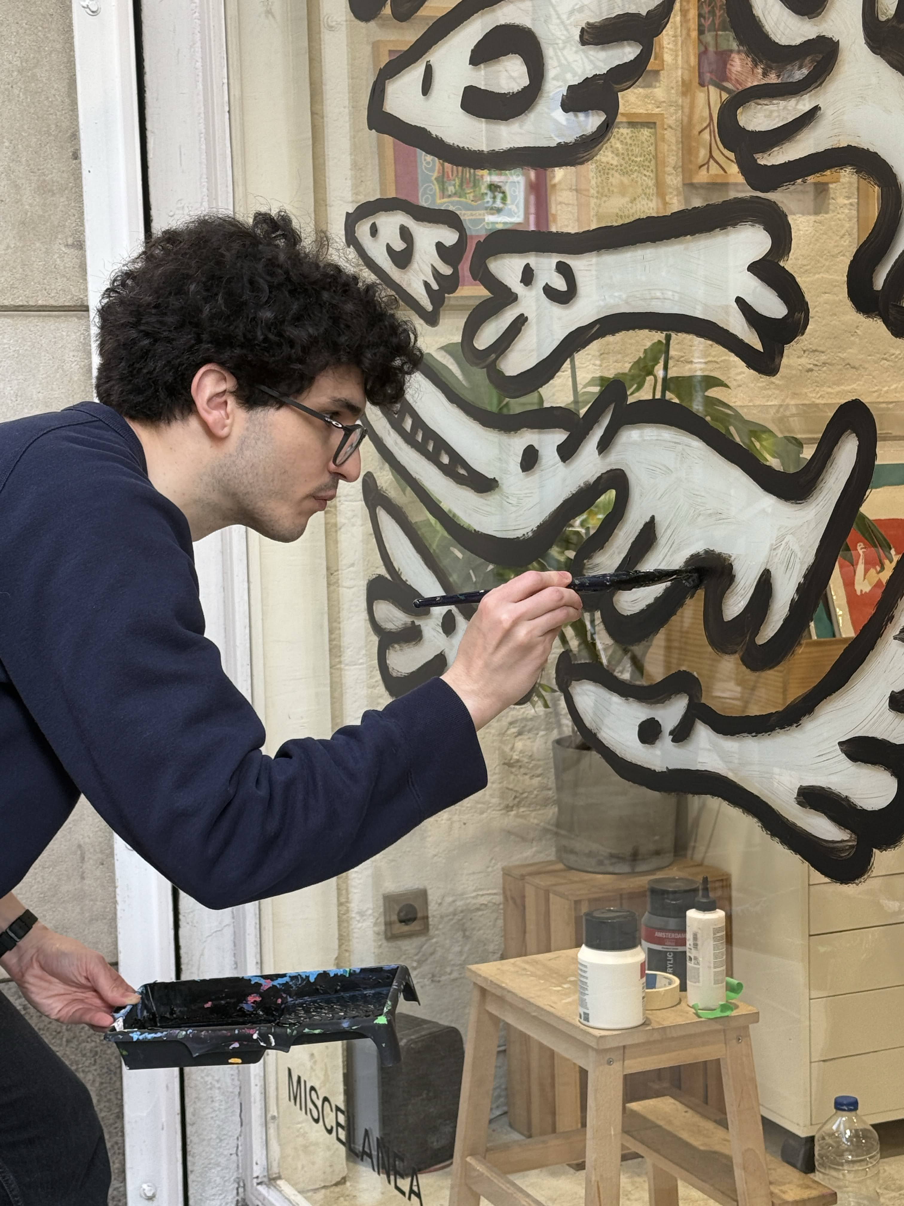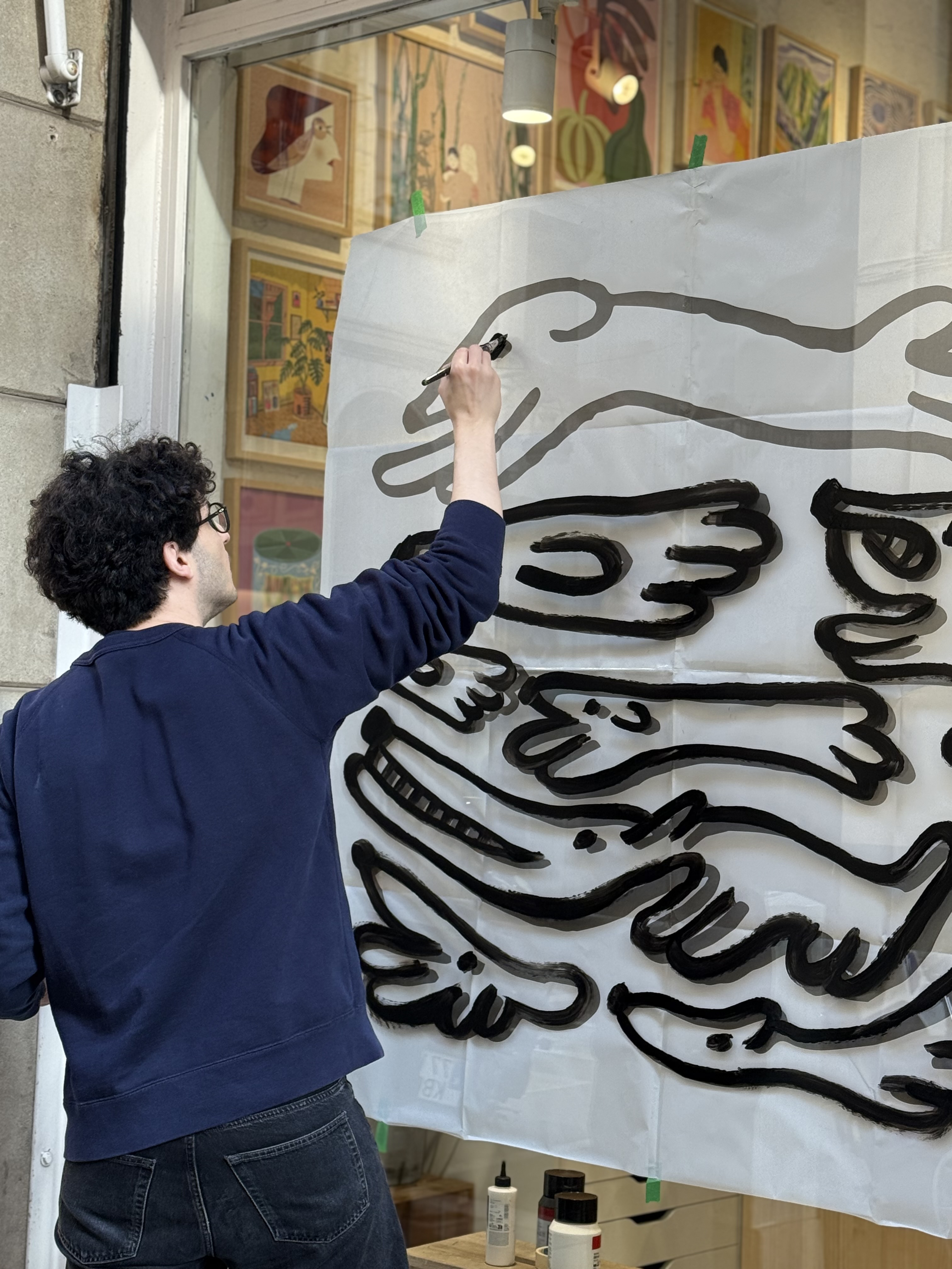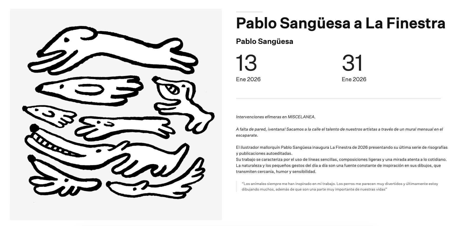 In january 2026 I painted a 2m x 2m illustration at the window of the shop and gallery Miscelanea in Barcelona. The illustration is based on a ink illustration of a group of dogs. The illustration comes with a text: