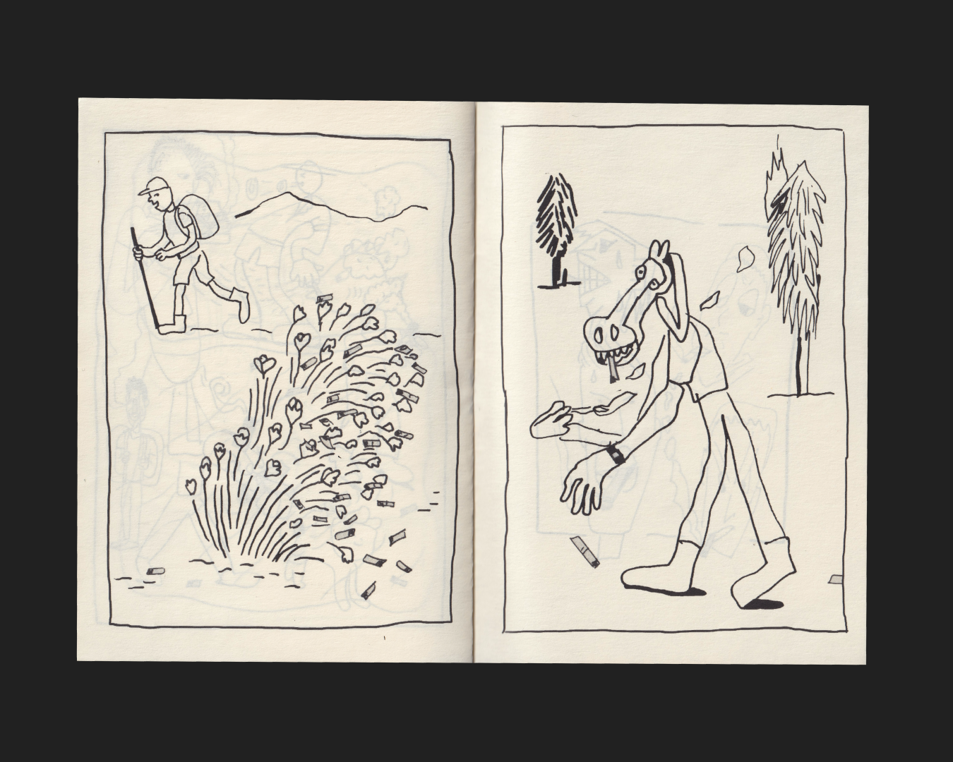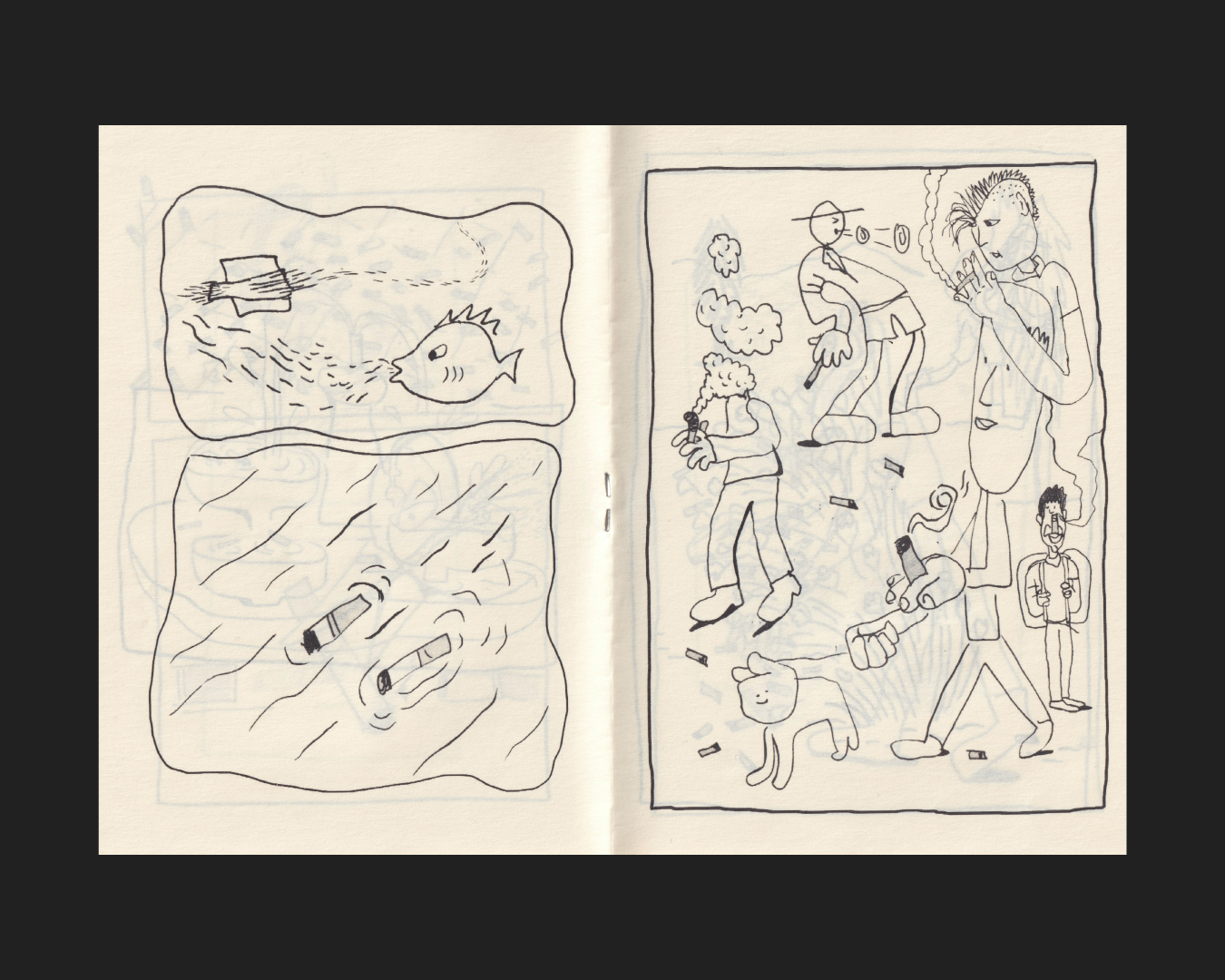 MAL is self published zine made with illustrations from different sketchbooks. The process to create this zine was to select the ilustration and to unify them for these style. The theme of MAL is to talk abut the pollution of the cigarrete butt we find everywhwere in our lives, from cities to the beaches and another parts of our natural enviorment.