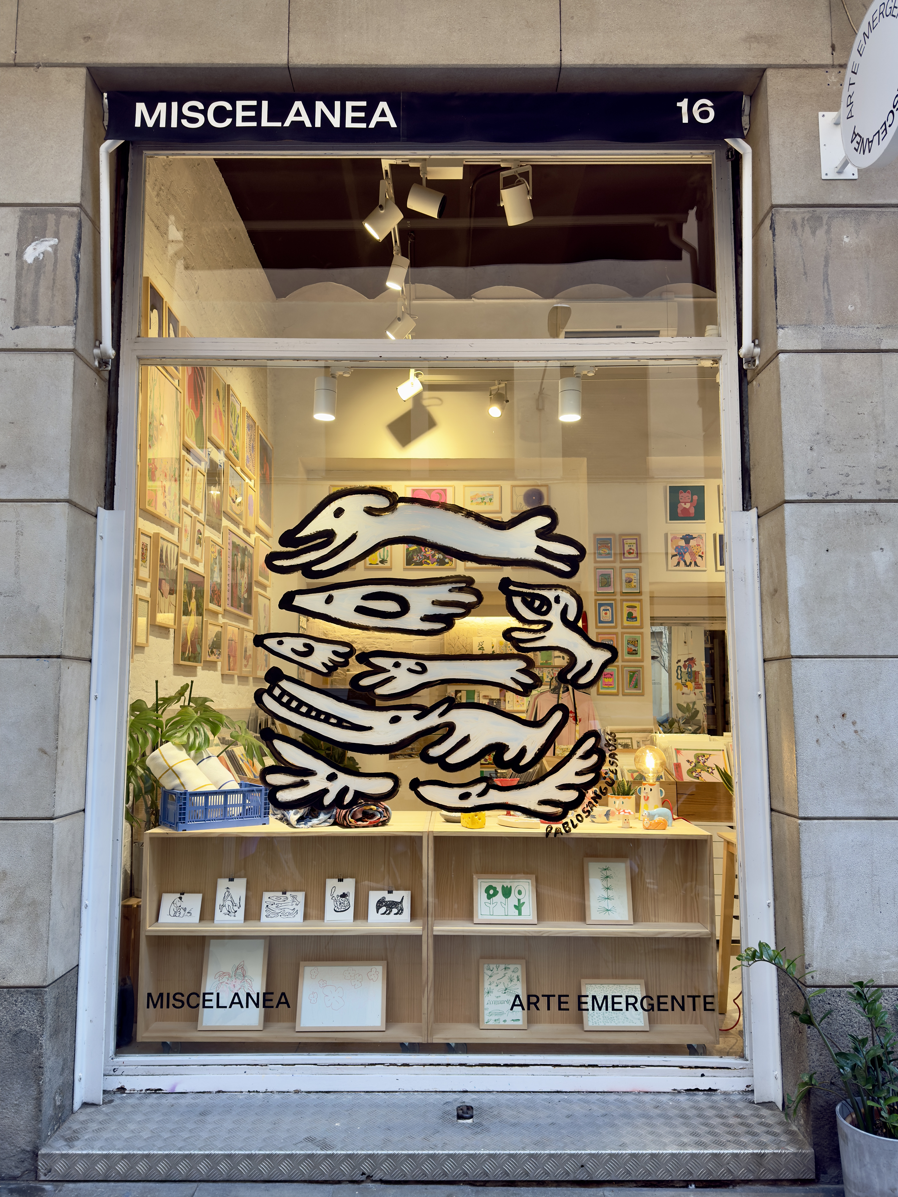 In january 2026 I painted a 2x2m illustration at the window of the shop and gallery Miscelanea in Barcelona. The illustration is based on a ink illustration of a group of dogs. The illustration comes with a text: